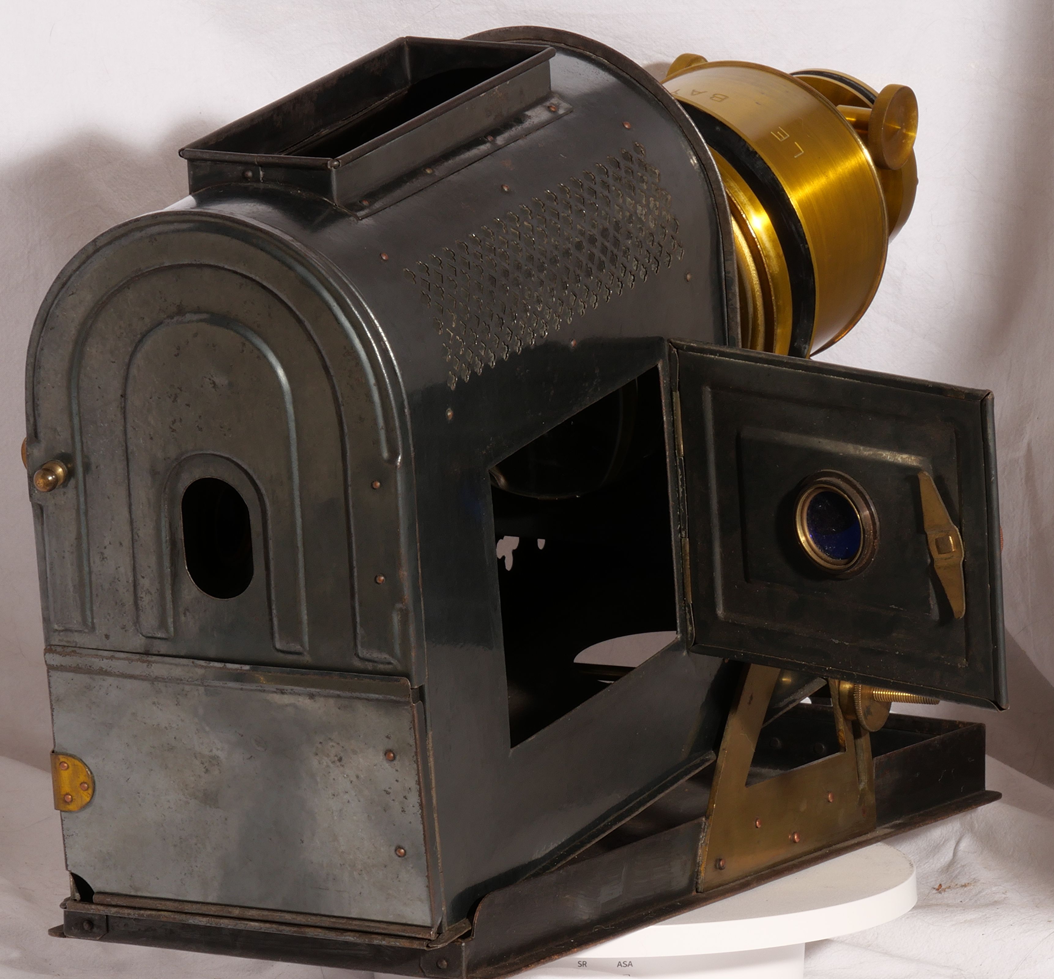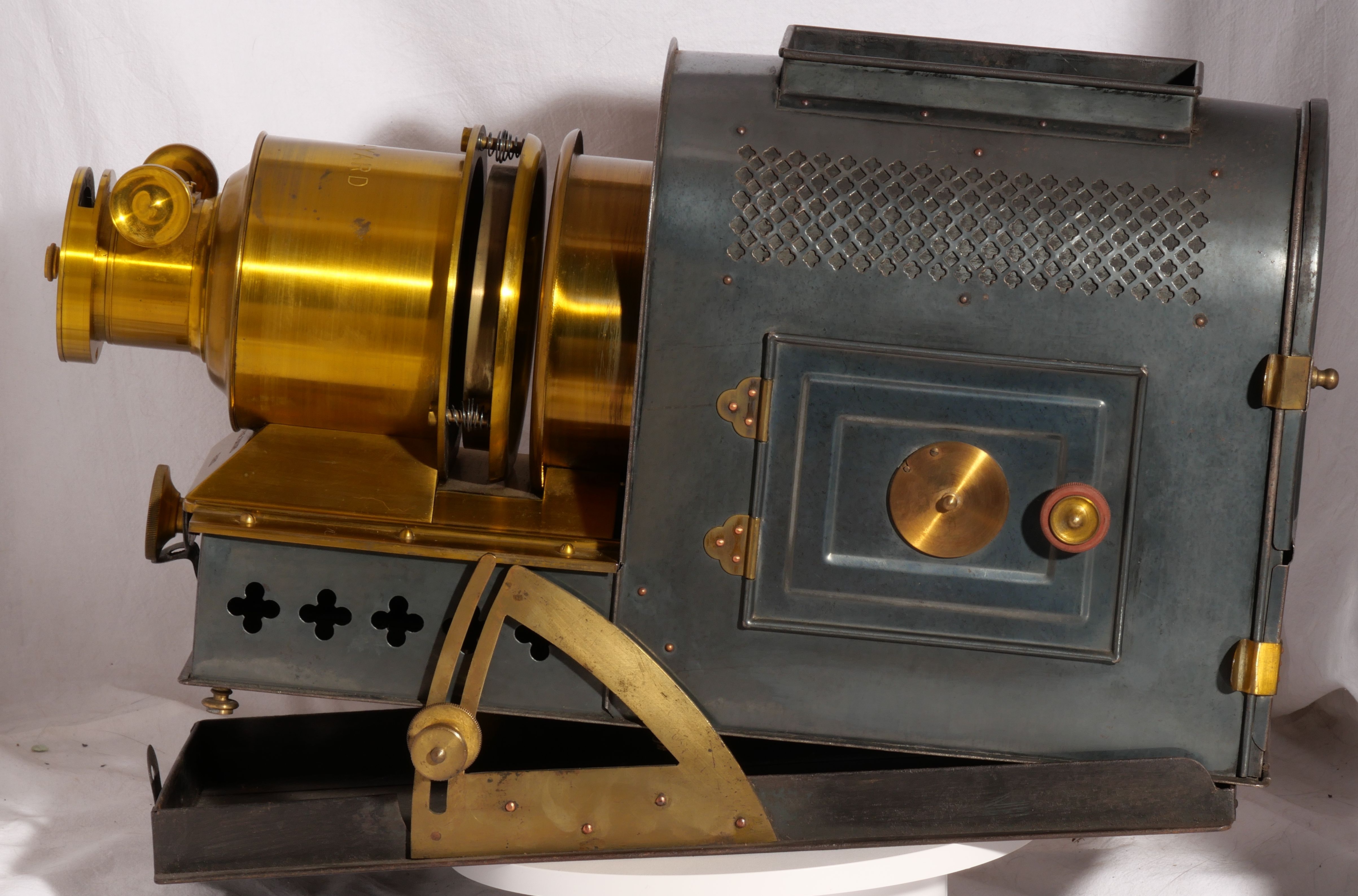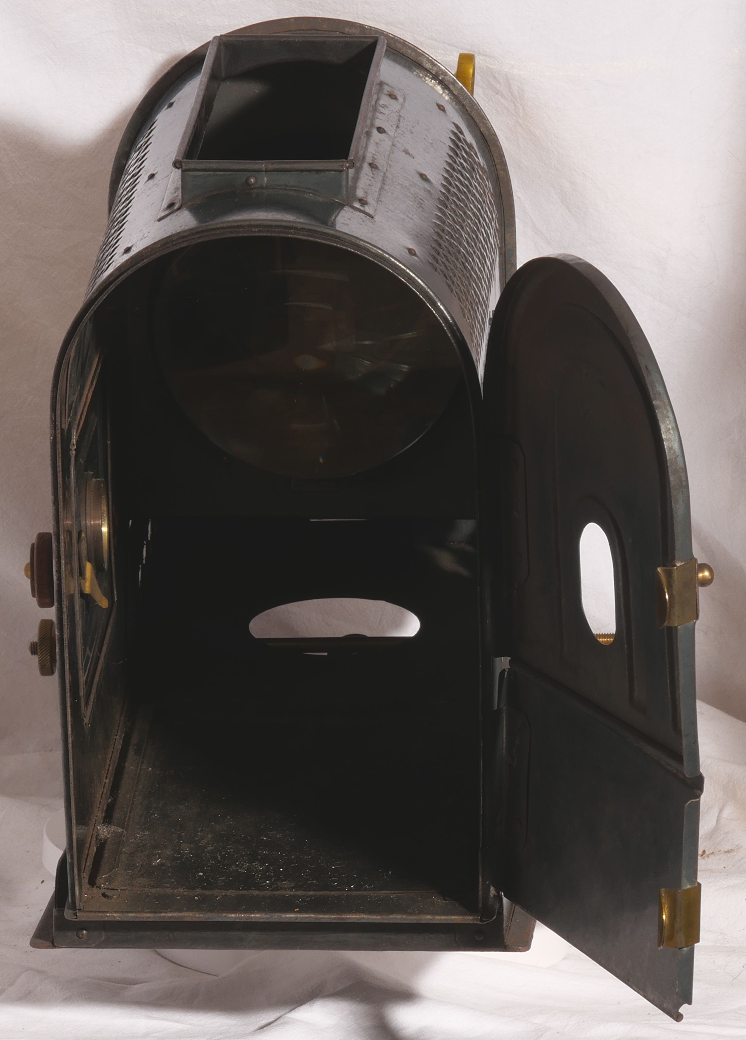 Cette lanterne de projection pour plaques 8,5 x 10 cm est équipée d'une lampe à pétrole très puissante à 5 mêches, dénommée Maximus.