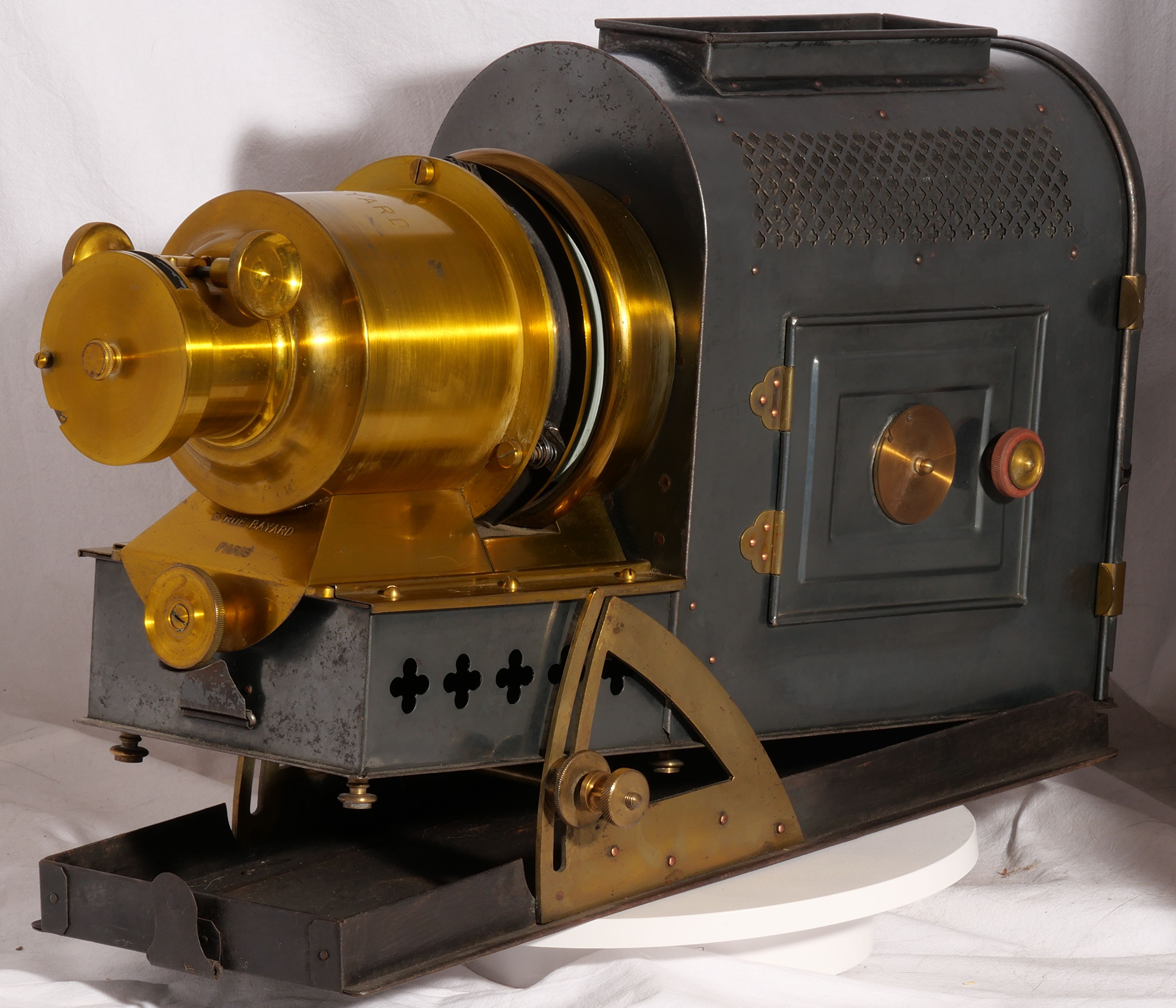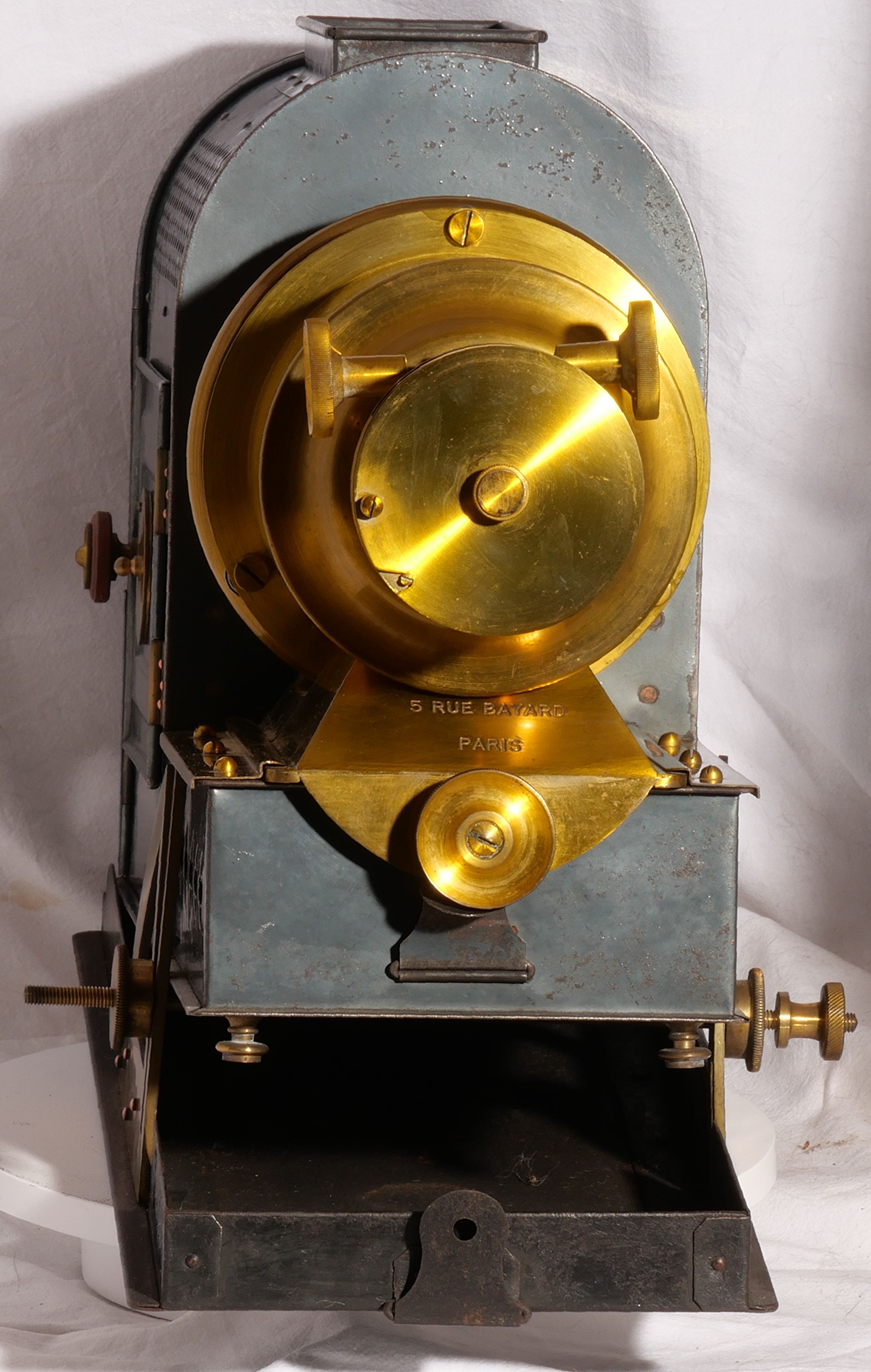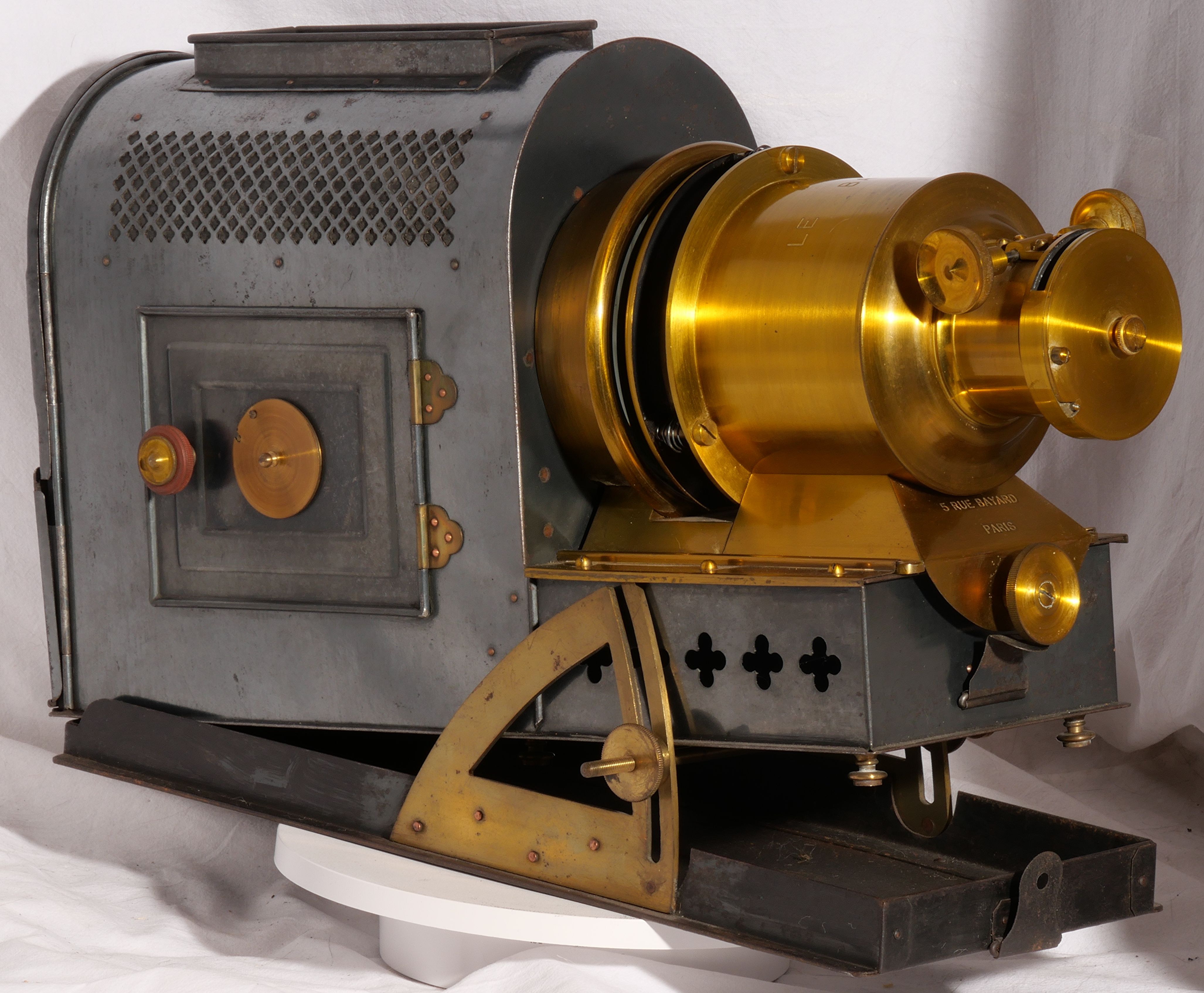 Cette lanterne de projection pour plaques 8,5 x 10 cm est équipée d'une lampe à pétrole très puissante à 5 mêches, dénommée Maximus.