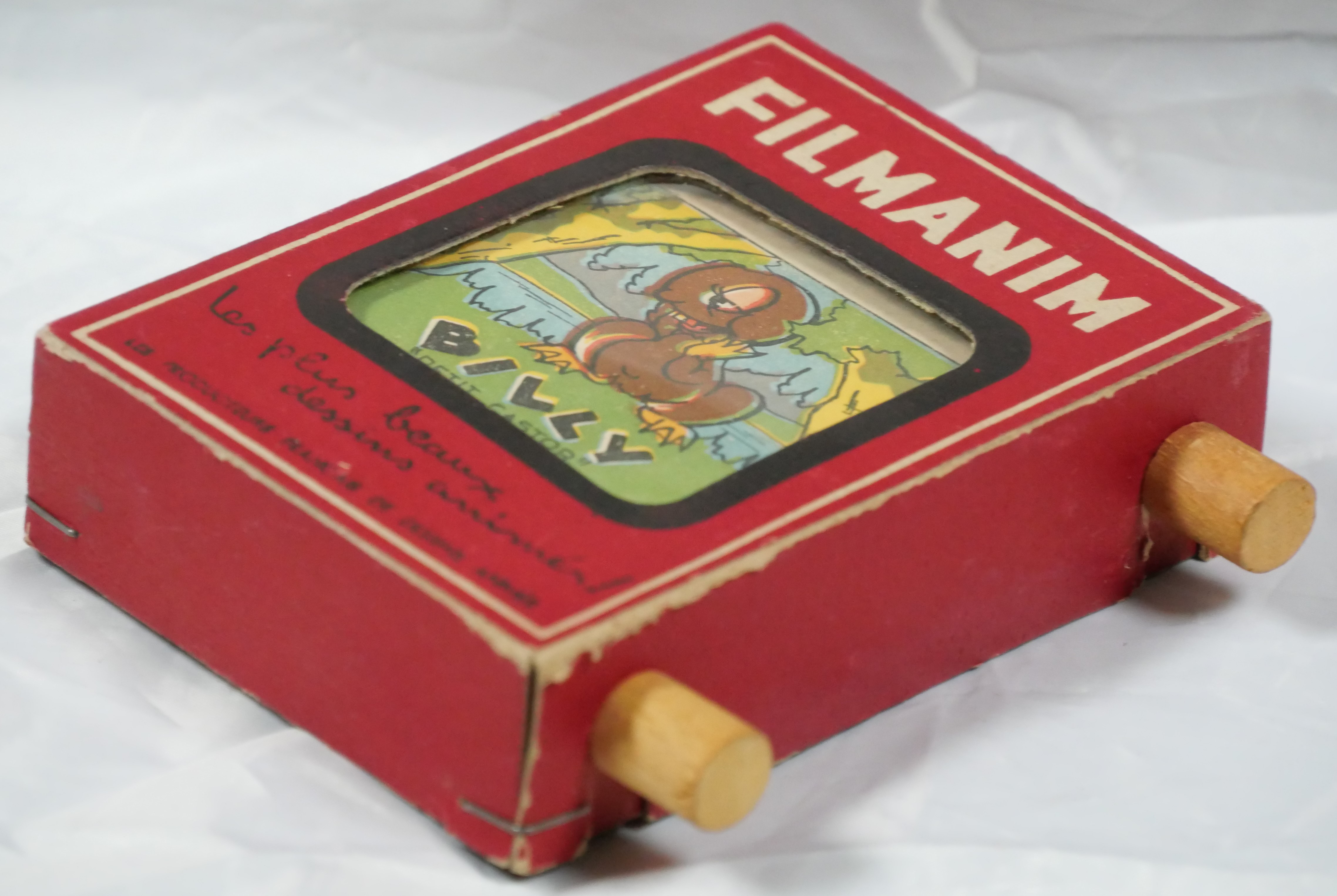 Il s'agit d'une petite visionneuse à main fabriquée en carton. La bande d'images est solidaire de deux rouleaux en bois et les images défilent derrière une fenêtre pratiquée sur la face avant.