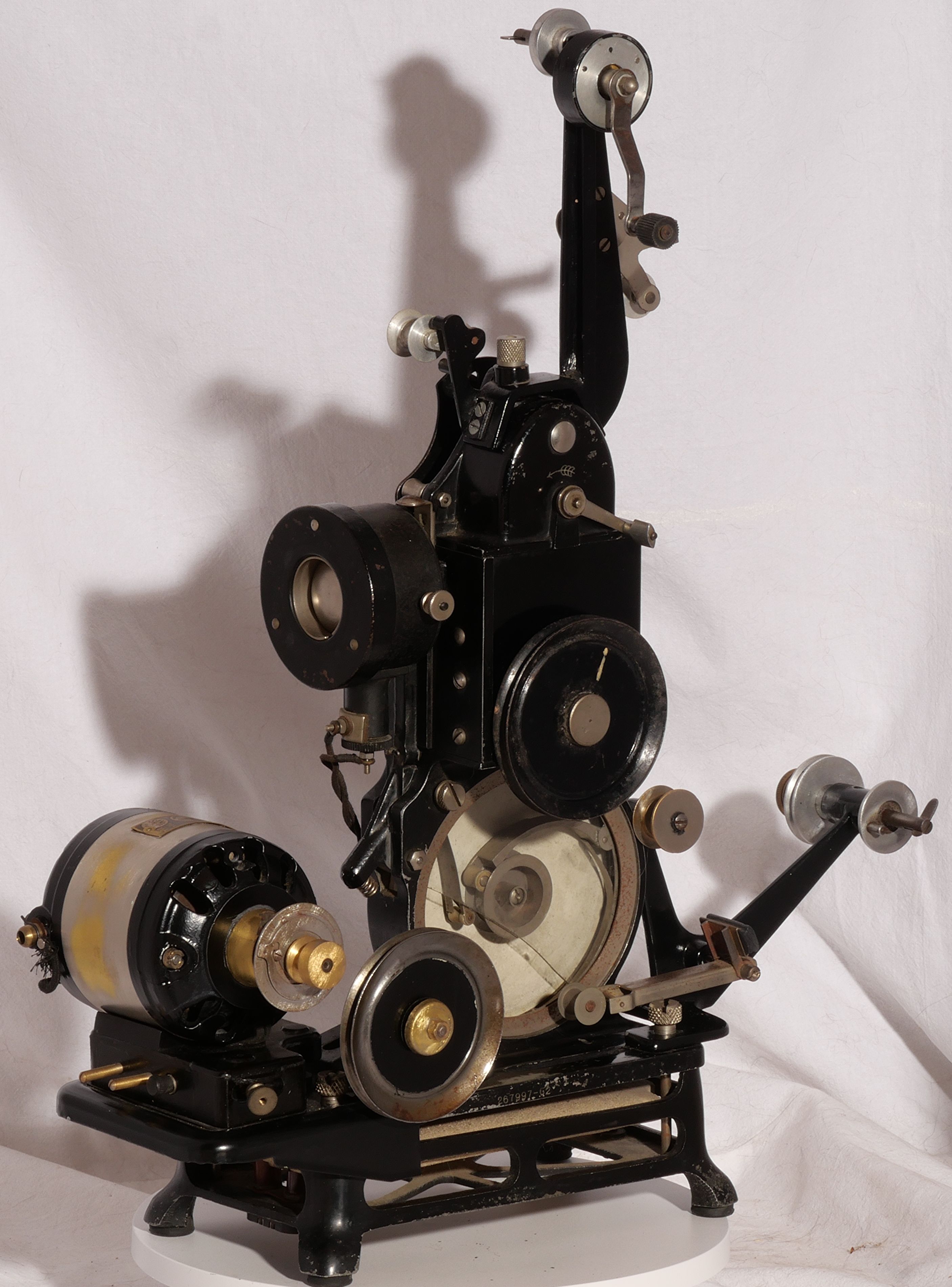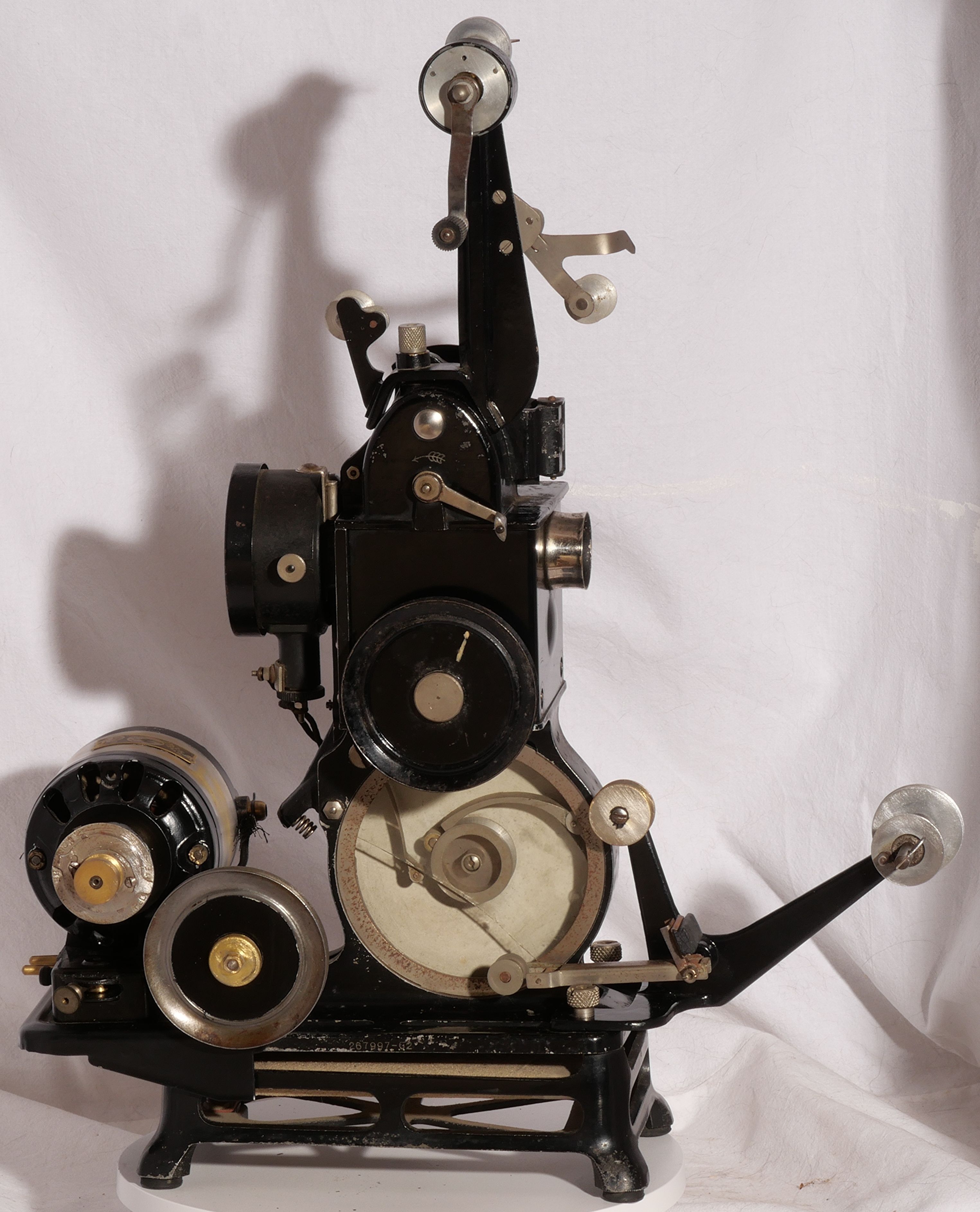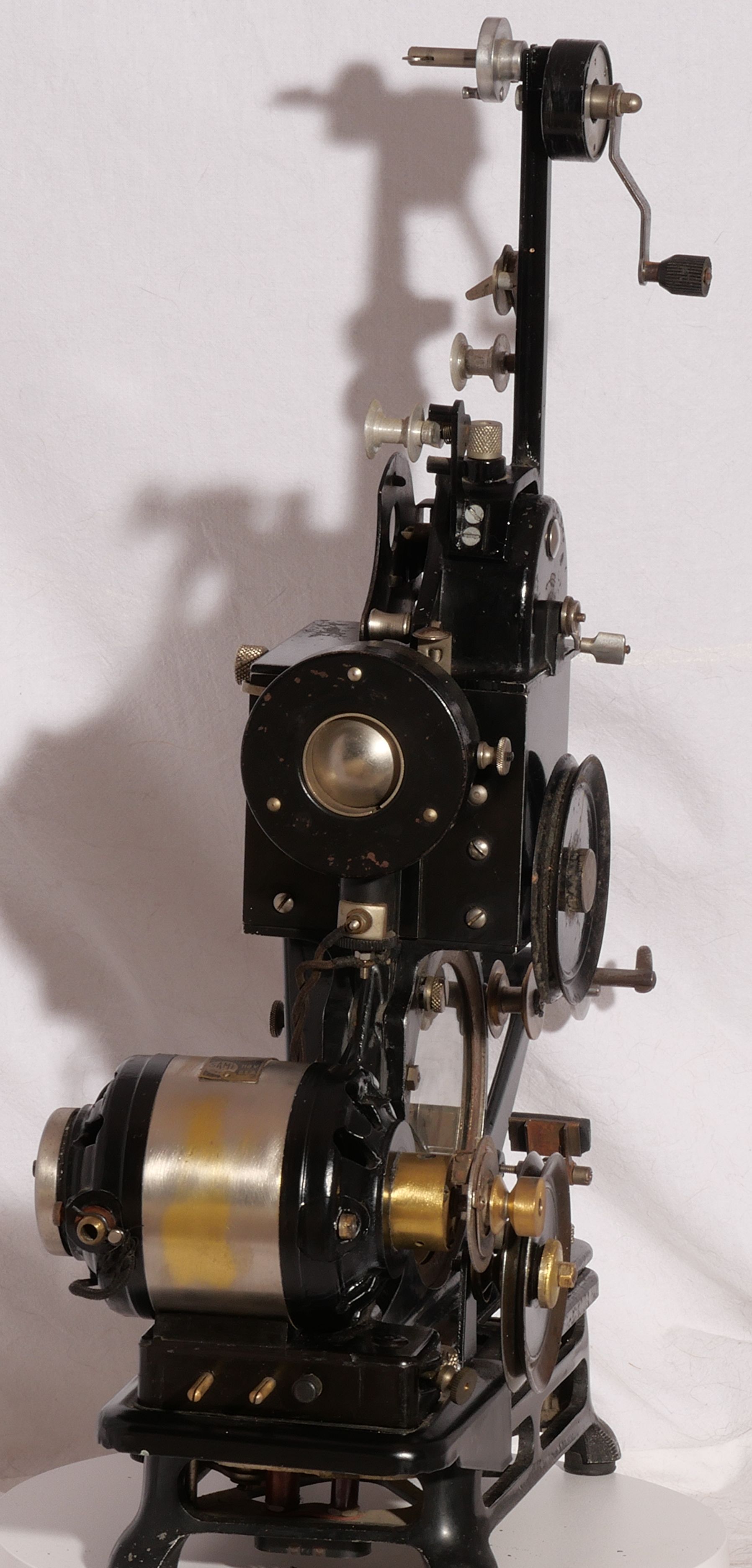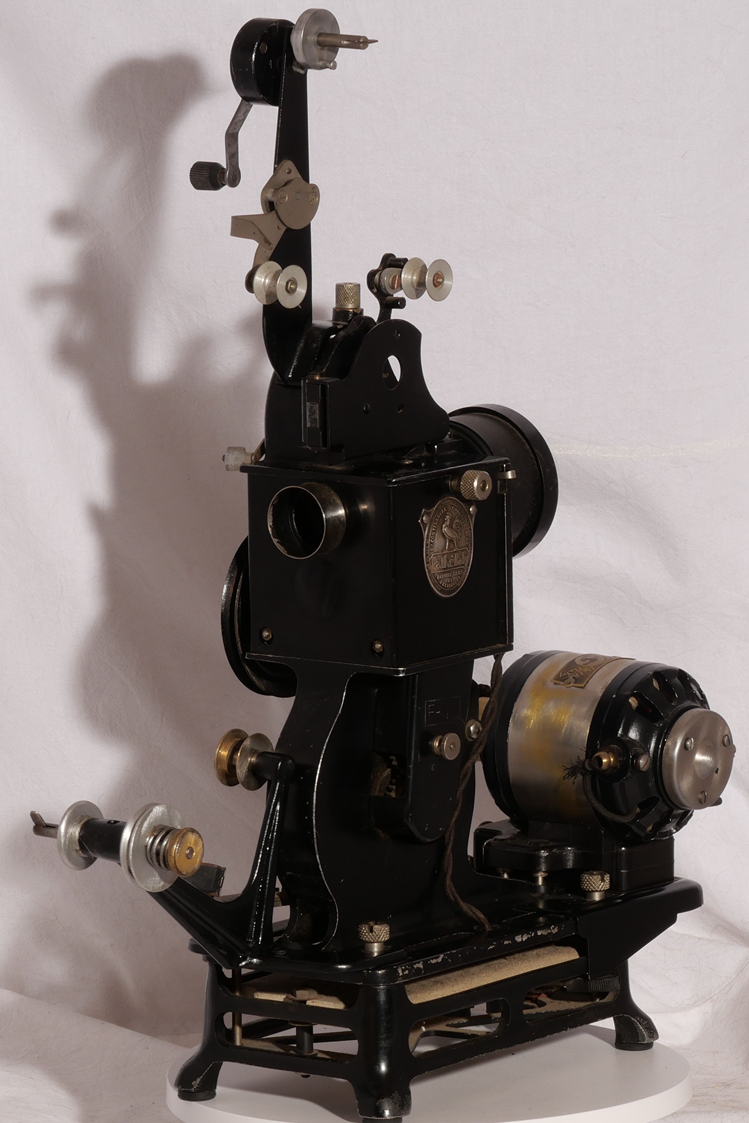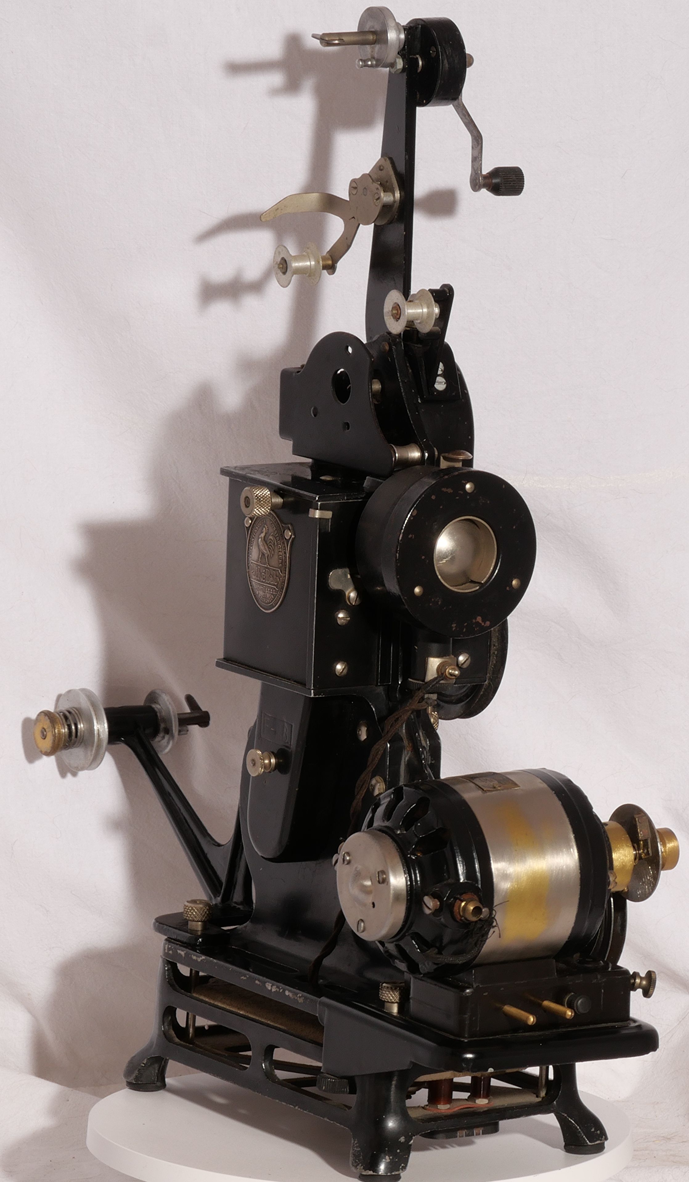 Ce Pathé-Baby est équipé d'une dynamo Type M.B.Y. n° 1270 6,5 Volts. Il est ainsi autonome et peut être utilisé dans les écoles ou les missions qui n'ont pas l'électricité.